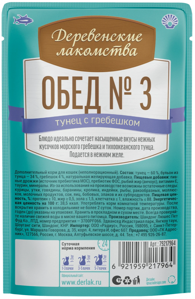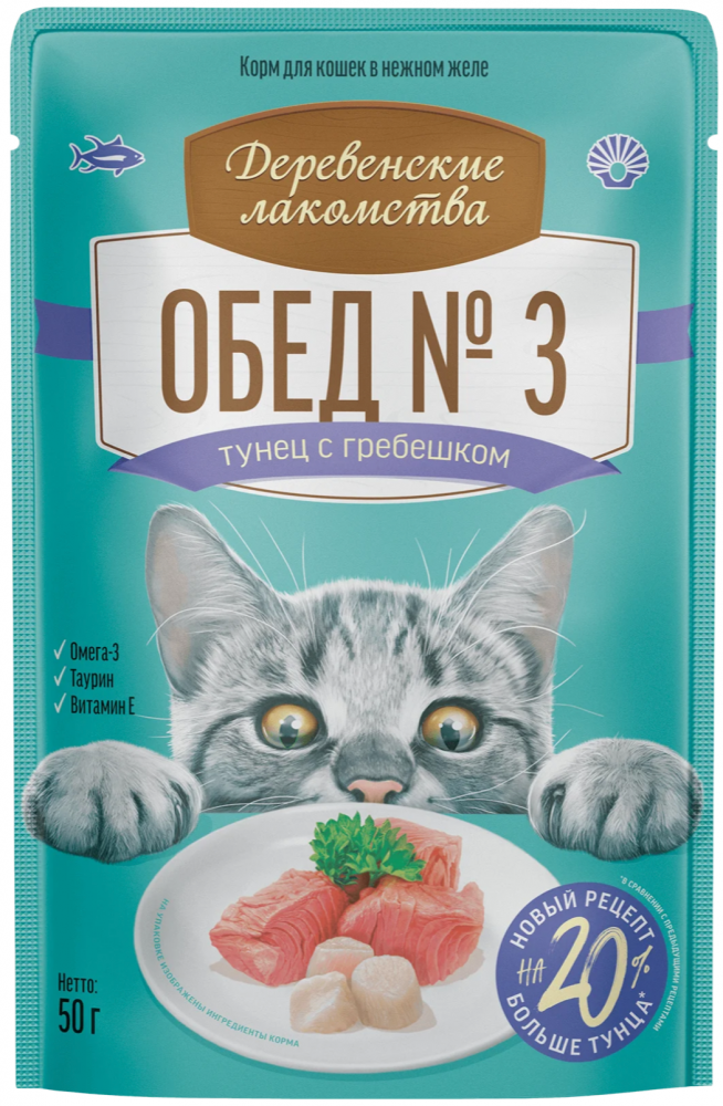 Консервированный влажный корм для кошек серии «Деревенские лакомства — Рыбные обеды» содержит большое количество мяса тихоокеанского тунца, которое идеально сочетается с насыщенным вкусом морского гребешка. Тёмное мясо тунца отличается нежной текстурой и более ярким ароматом, такое мясо насыщает корм вкусом морской рыбы. Подаётся в нежном желе, которое не только улучшает текстуру корма, но и способствует лучшему усвоению питательных веществ. Дополнительный (неполнорационный) корм для кошек. Состав: тунец 60 %, бульон из тунца 34 %, гребешок 4 %, натуральная желирующая добавка. Пищевая ценность, %: протеин — 10, жиры — 0,5, клетчатка — 1, зола — 1,5, влажность — 88. Пищевые добавки: пивные дрожжи (источник пребиотика МОС), пребиотик ФОС, рыбий жир (анчоус), витамин Е, таурин, минералы. Энергетическая ценность: 38,5 ккал / 100 г. Подробнее