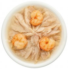 Состав: тунец 54 %, креветка 4 %, бульон из тунца 40 %, натуральная желирующая добавка.nПищевые добавки: пивные дрожжи (источник пребиотика МОС), пребиотик ФОС, рыбий жир (анчоус), витамин Е, таурин, минералы.nПищевая ценность, %: протеин — 10; жир — 0,8; клетчатка — 1; зола — 1,5; влажность — 89;nЭнергетическая ценность на 100 г — 45 ккал.
