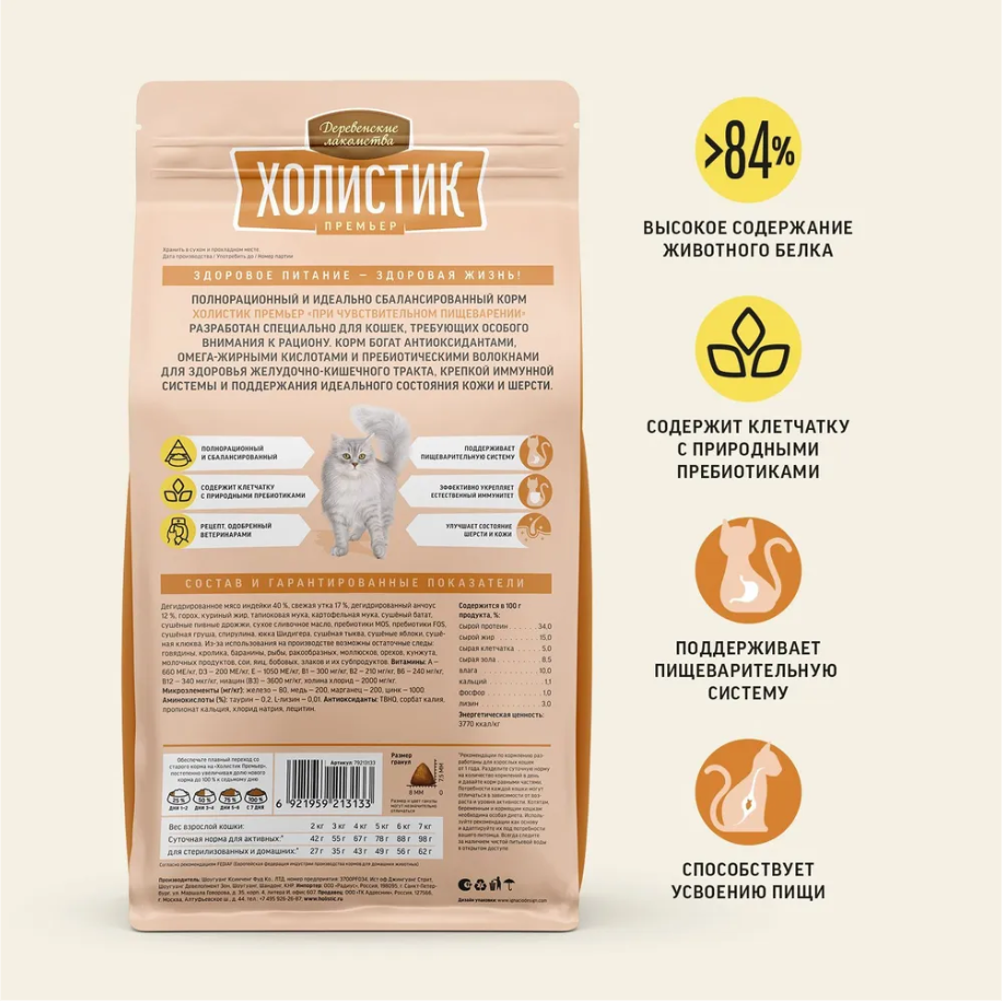 Сухой корм "Деревенские лакомства Холистик Премьер" для кошек с чувствительным пищеварение, индейка