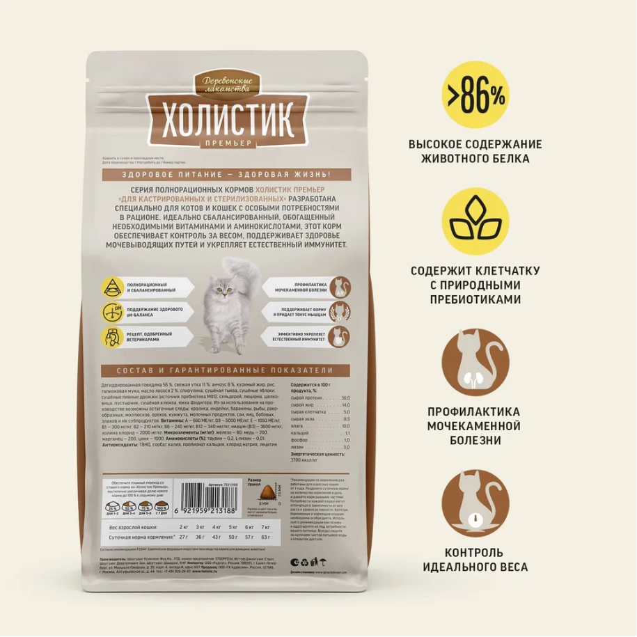 Сбалансированный, натуральный, полнорационный корм «Деревенские лакомства Холистик Премьер» обеспечивает питомцев всем необходимым для поддержания здоровья на каждом этапе жизни. В уникальных рецептах учтены не только вкусовые предпочтения кошек, но и их физиологические особенности, уровень активности и возраст. Благодаря содержанию в корме «Холистик Премьер» свежего мяса, кошка получает легко усваиваемый высококачественный животный белок, что обеспечивает её большим количеством необходимых аминокислот, витаминов и минералов. А наличие в составе высокого процента овощей и фруктов даёт оптимальное соотношение белков-жиров-углеводов и клетчатки. Питание кастрированных и стерилизованных кошек направлено на то, чтобы удовлетворить возросший аппетит питомца не увеличивая калорийность корма и обеспечить правильное функционирование его мочевыделительной системы. Идеально сбалансированный, обогащенный необходимыми витаминами и аминокислотами корм «Деревенские лакомства Холистик Премьер для кастрированных и стерилизованных кошек. Говядина» обеспечивает контроль за весом питомца, поддерживает здоровье мочевыводящих путей и общего физического состояния. • Высокое содержание говядины >45% обеспечивает активность и физическое здоровье кошки, при этом не грозит ожирением • Для защиты от инфекций мочевыводящих путей и регулирования кислотность мочи в состав корма включена супер-ягода – клюква • Содержание анчоуса в рецепте корма даёт питомцу широкий набор незаменимых аминокислот и способствует поддержанию здорового веса • Здоровое пищеварение, своевременные и качественные детоксикационные процессы обеспечит тапиока • Овощи и фрукты, богатые клетчаткой, обеспечивают организм природными пребиотиками • В составе корма отсутствуют глютен, ароматизаторы, красители, синтетические консерванты и усилители вкуса. Полнорационный сухой корм «Деревенские лакомства Холистик Премьер для кастрированных и стерилизованных кошек» - рецепт здорового роста и развития! Подробнее