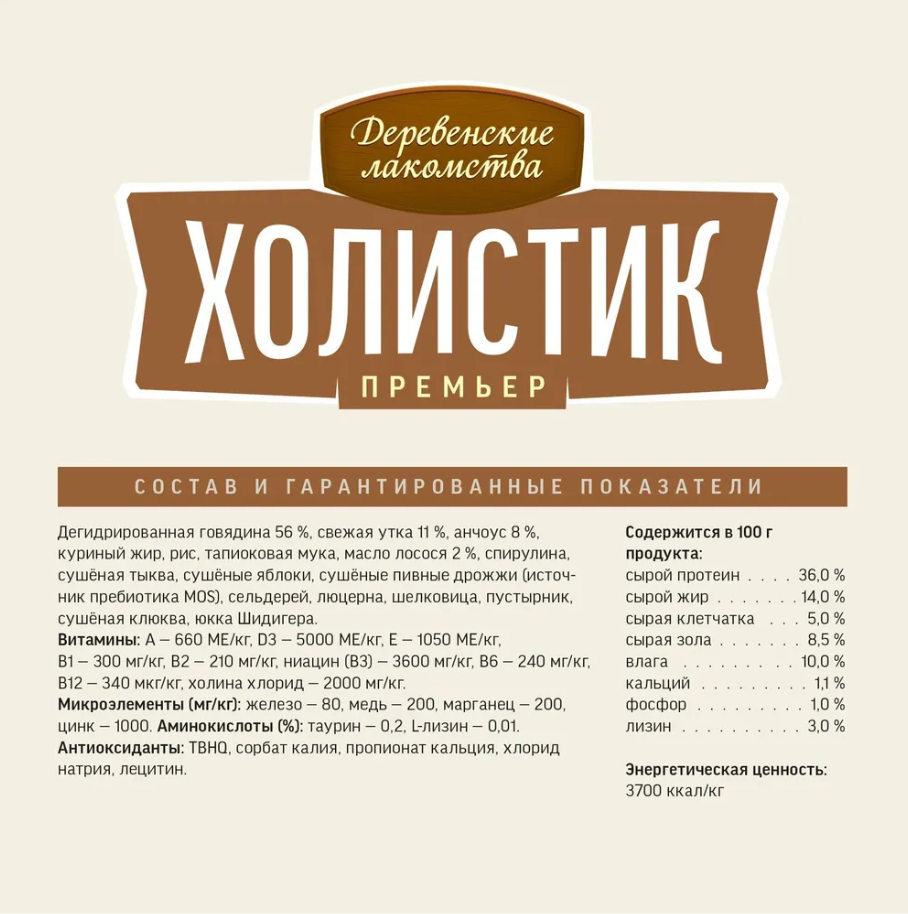 Состав: дегидрированная говядина 56%, свежая утка 11%, дегидрированный анчоус 8%, куриный жир, рис, тапиоковая мука, масло лосося 2%, спирулина, сушеная тыква, сушеные яблоки, сушёные пивные дрожжи (источник пребиотика MOS), сельдерей, люцерна, шелковица, пустырник, сушеная клюква, юкка Шидигера.nЭнергетическая ценность: 3700 Ккал/кг.