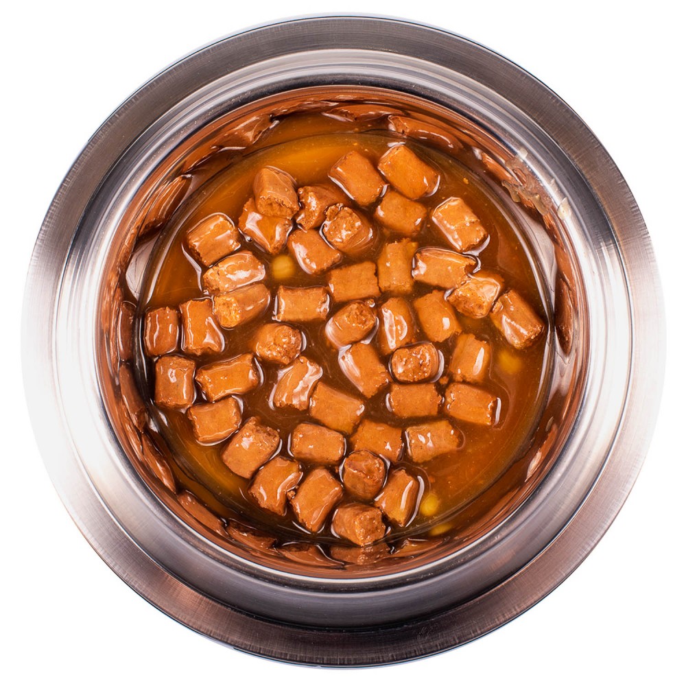 Корм изготовлен из запеченного лосося, не содержит злаков. Формула содержит глюкозамин и хондроитин для поддержания здоровья суставов. став: мясо и мясные субпродукты, рыба и рыбные субпродукты 25% (свежий лосось 14%), минеральные вещества, глюкозамин 0,008%, хондроитина сульфат 0,004%. Питательная ценность в одном кг: сырой белок 10.5%, сырая клетчатка 0.5%, сырой жир 6.0%, сырая зола 1.8%. Влага 78.5%. Питательные добавки в одном кг: витамин D3: 250 МЕ, витамин E (альфа-токоферола ацетат): 8 мг. Рекомендации по кормлению: Продукт подавать комнатной температуры. Важно, чтобы животное всегда имело доступ к чистой свежей воде. Открытую упаковку хранить в холодильнике не более 24 часов. Размер собаки Суточная норма, г Мелкие породы 1-3 пауча Средние породы 3-4 пауча Крупные породы 4-8 пауча Подробнее