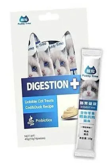 Суперпремиальное функциональное Paddy Time Digestive health лакомство-пюре на основе трески с филе куринцы, утки и гидролизованного тунца для улучшения пищеварения кошки.
