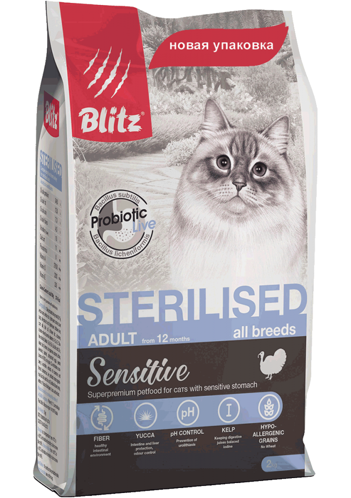 Корм сухой для кошек Blitz Sterilised при стерилизации и кастрации с индейкой