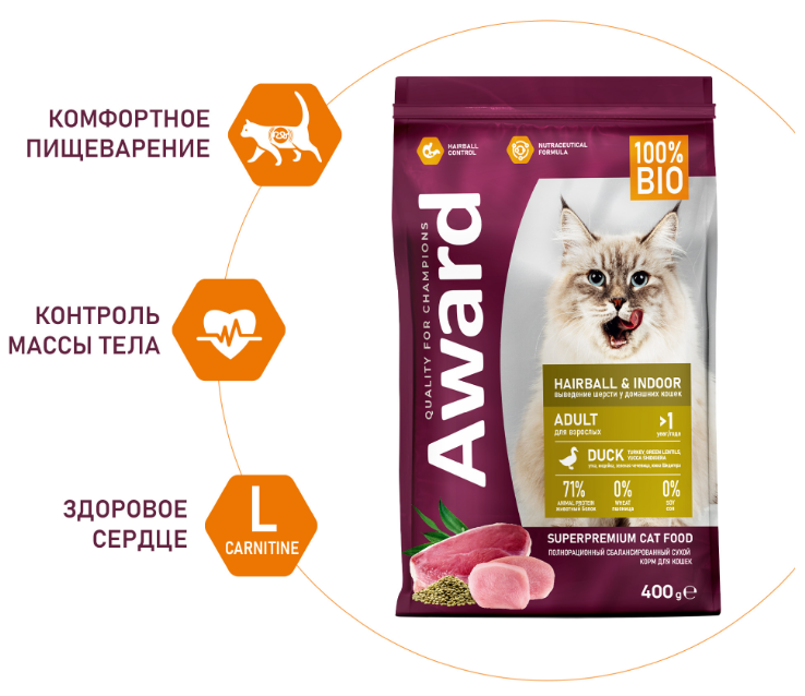 Сухой корм AWARD Hairball & Indoor для взрослых кошек для выведения шерсти с уткой и индейкой с добавлением зеленой чечевицы и Юкки Шидигера