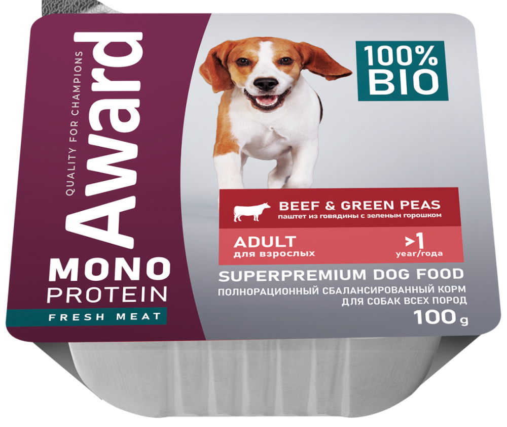 Влажный корм AWARD Monoprotein для взрослых собак паштет из говядины с зеленым горошком 100 г