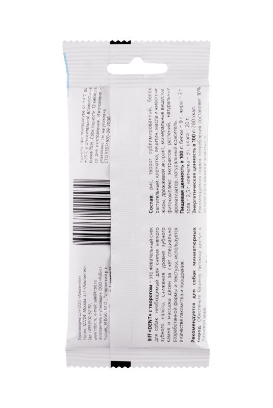 Biff «DENT» с творогом – это жевательный снек для собак, необходимый для снятия мягкого зубного налёта, снижения уровня зубного камня и массажа дёсен за счет специально разработанной формы и текстуры, используется в качестве лакомства и поощрения.