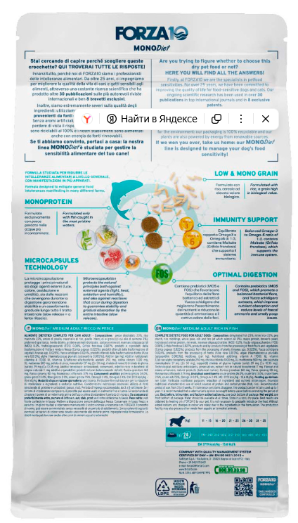 FORZA10 Medium Diet ИЗ РЫБЫ – это монопротеиновый корм для собак, разработанная компанией SANYpet для собак средних пород с пищевой непереносимостью на мясо животных интенсивного животноводства. Идеальное соотношение Омега 3 и Омега 6, которых критически не хватает в традиционных кормах для животных. Клинически доказано, что риск возникновения аллергических реакций и пищевой непереносимости у большинства животных значительно снижен, если их рацион составлен из продуктов, полученных из неинтенсивного животноводства. Показания: для чувствительных собак среднего размера с пищевой непереносимостью на мясо из интенсивного животноводства. Для сокращения пищевой аллергии и непереносимости на ингредиенты и питательные вещества кормов. Рекомендации по применению: от 3 до 8 недель. Если симптомы непереносимости вновь проявляются при переходе на другие корма, то данный корм можно использовать на протяжении всего периода роста Вашего питомца. Состав: рыбная мука 23%, молотый рис 21%, цельный горох, рисовые отруби, гороховый крахмал, масла и жиры (рыбий жир 2%), глютен майса, минеральные вещества, пивные дрожжи, продукты животного происхождения, Манноолигосахариды (МОС), ФОС, Мейтаке (Grifola frondosa) 0.027%, Юкка Шидигера, продукты и субпродукты свежих фруктов и овощей (Папайя (Carica papaya) 0.025%), продукты, полученные в результате переработки растений (Ананас (Ananas spp.) 0.025%), продукты полученные в результате переработки растений (Алоэ вера (Aloe vera) 0.013%), водоросли (Haematococcus pluvialis (aстаксантин 0.005%)). Добавки (на кг): витамин А — 17000 МЕ, витамин Е — 250 мг, хлорид холина — 1000 мг, DL-метионин — 500 мг, моногидратный сульфат цинка — 137 мг (Zn — 50 мг), хелат меди в гидрате глицина — 39 мг (Cu — 10.35 мг). Технологические добавки: антиоксиданты, консерванты, богатый токоферолом экстракт натурального происхождения — 11 мг. Натуральные растительные добавки: Гранат обыкновенный (Punica granatum) — 150 мг, Женьшень (Panax ginseng) — 50 мг, Розмарин лекарственный (Rosmarinus officinalis) — 21.5 мг. Содержание питательных веществ: влажность — 8.0%, сырой белок — 26.0%, сырые жиры и масла — 13.0%, сырая клетчатка — 2.5%, сырая зола — 7.5%, кальций — 1.5%, фосфор — 1.0%, Омега-3 — 0.8%, Oмега-6 — 2.4%. Энергетическая ценность: 3520 ккал/кг — 14.7 МДж/кг. Лекарственные растения: Красные водоросли: содержат астаксантин, с сильными антиоксидантным и иммуномодулирующим действиями. Майтаке: это съедобный гриб, растущий в северных регионах Японии и восточных регионах Северной Америки. Высокое содержание бетаглюканов обеспечивает прекрасное воздействие на иммунную систему. Алоэ: благодаря высокому содержанию активных веществ обладает успокаивающим, иммуностимулирующим и очищающим свойствами. Гранат: насыщен полифенолами, которые противостоят окислению липидов и вредному воздействию свободных радикалов, в нём содержатся незаменимые жирные кислоты, олеиновая и линолевая, которые так необходимы организму. Папайя: антиоксидант богатый витамином С, магнием, кальцием и калием, усиливает естественные защитные функции организма. Женьшень:заряжает организм энергией, особенно полезен при любых стрессовых состояниях. Ананас: плод, особенно в области ножки, содержит многочисленные полезные вещества, среди которых бромелин, протеолитический энзим, способствующий процессу пищеварения. Защищенные микрокапсулы: Небольшие липидные сферы сохраняют и защищают натурал
