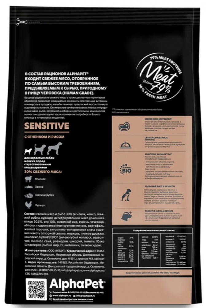 СоставnСвежее мясо и рыба 30% (ягненок, хамса, говяжий рубец, курица), дегидрированное мясо домашней птицы 20,5%, рис 10%, животный жир, ячмень, чечевица, яблоко, гидролизованная куриная печень, картофель, желтый горошек, витаминно-минеральная смесь сушеная мякоть сахарной свеклы, морковь, пивные дрожжи, комплекс AlphaPetBIO® (зеленогубый моллюск, одуванчик, льняное семя, розмарин, цикорий, томаты, Юкка Шидигера), рыбий жир, DL-метионин, антиоксидант.