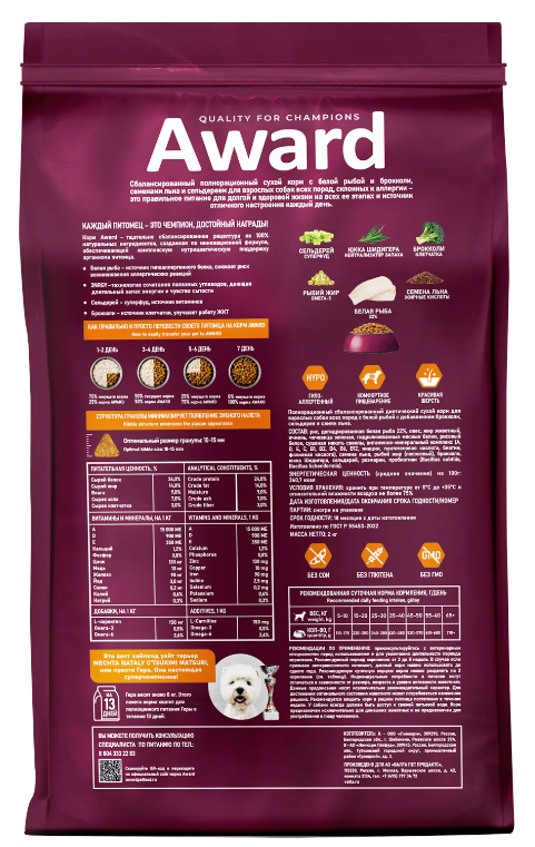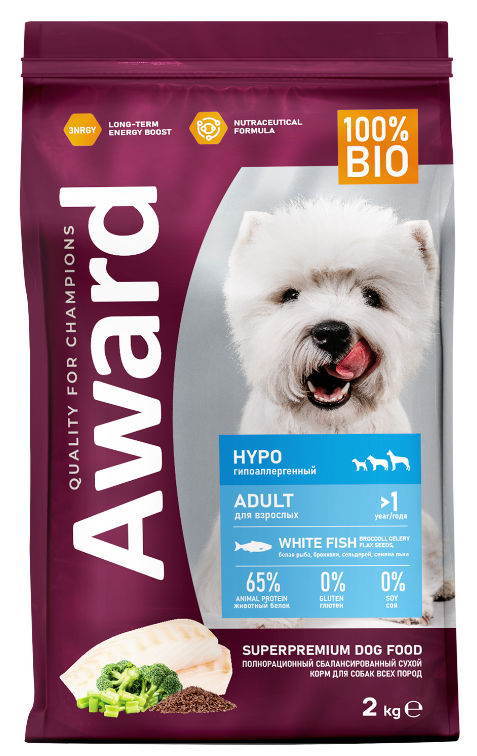 Сухой корм AWARD HYPO для собак всех пород с белой рыбой, брокколи, сельдерея и семян льна