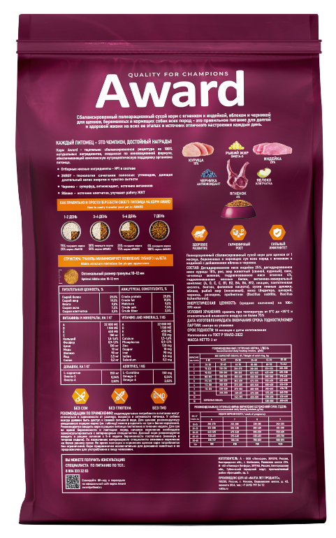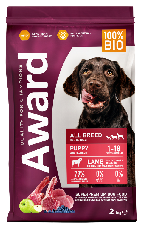 Сухой корм AWARD для щенков от 1 месяца, беременных и кормящих сук всех пород с ягненком и индейкой с добавлением яблока и черники