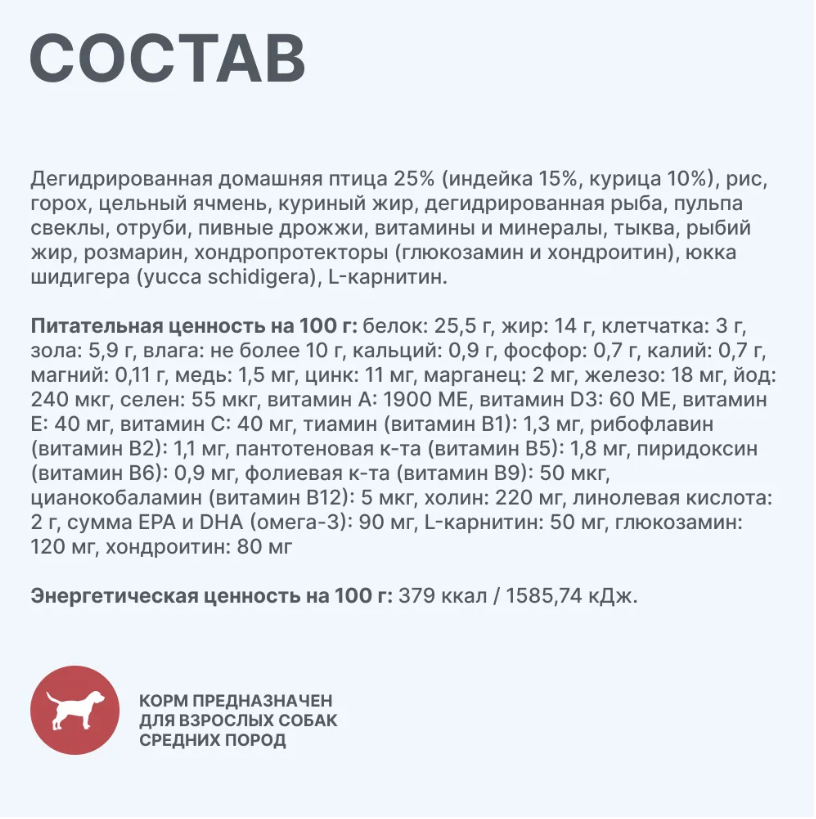 СоставnДегидрированная домашняя птица 25 % (индейка 15 %, курица 10 %), рис, горох, цельный ячмень, куриный жир, дегидрированная рыба, пульпа свеклы, отруби, пивные дрожжи, витамины и минералы, тыква, рыбий жир, розмарин, хондропротекторы (глюкозамин и хондроитин), юкка шидигера (yucca schidigera), L-карнитин.