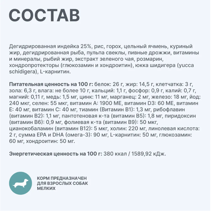СоставnДегидрированная индейка 25 %, рис, горох, цельный ячмень, куриный жир, дегидрированная рыба, пульпа свеклы, пивные дрожжи, витамины и минералы, рыбий жир, экстракт зеленого чая, розмарин, хондропротекторы (глюкозамин и хондроитин), юкка шидигера (yucca schidigera), L-карнитин.