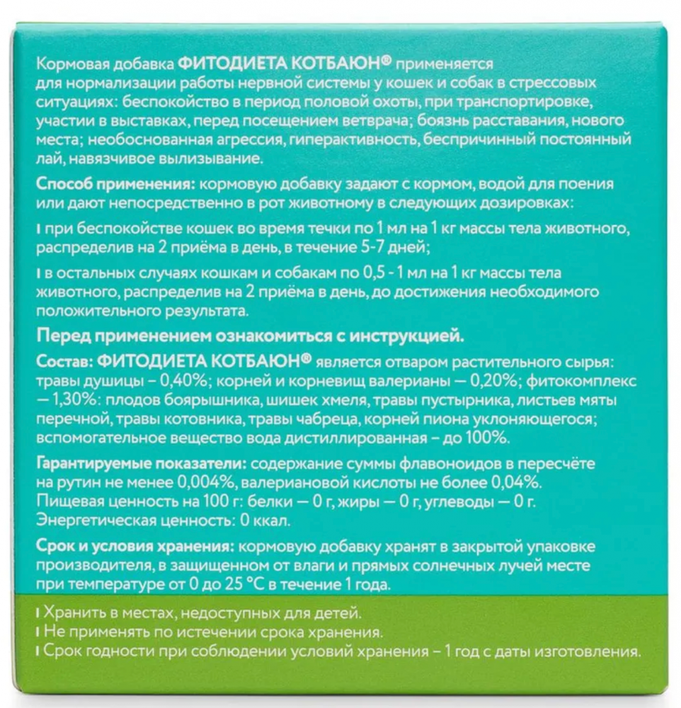 Лекарственное средство применяют перорально: кошкам по 2 мл (0,5 чайной ложки), собакам по 4 мл (1 чайная ложка) 3-4 раза в день в течение 5-7 дней ежемесячно, либо добавляют в воду для питья. Кот Баюн® настой не содержит консервантов, поэтому при его применении следует соблюдать следующие требования: перед применением флакон откупоривают, надевают на его горловину крышку-капельницу и выливают лекарственное средство в чайную ложку в соответствии с дозировкой. Затем лекарственное средство добавляют в воду для питья, либо выпаивают животному из ложки в неразбавленном виде. Оставшееся лекарственное средство хранят в холодильнике в течение 7 дней, не снимая крышки-капельницы с флакона. Перед применением лекарственное средство следует нагреть до комнатной температуры и встряхнуть. Кот Баюн® таблетки применяют, начиная с 10-месячного возраста, для коррекции поведения кошек и собак: - агрессии (по отношению к хозяину; связанной с борьбой за доминирование или обусловленной страхом), - фобий (страха перед шумом; боязни расставания; страха и возбуждения перед выставками и при транспортировке), - нарушения сексуального поведения (половой агрессии; имитации покрытия; криков кошек во время половой охоты; чрезмерного беспокойства при ложной щенности, мечения в квартире), - гиперактивности, - беспричинного постоянного лая, - навязчивого вылизывания, - копрофагии. Состав: Кот Баюн® - лекарственное средство в форме стерильного водного настоя лекарственных растений: травы душицы – 0,45%, травы донника – 0,23%, корневища с корнями валерианы – 0,23%; цветов и плодов боярышника, шишек хмеля, травы пустырника, листьев мяты перечной, травы будры плющевидной, травы котовника, травы мелиссы, цветов таволги вязолистной, травы зверобоя, травы чабреца, травы сушеницы топяной, травы солянки холмовой, листа крапивы, корней пиона уклоняющегося – 1,45% и воды дистиллированной - до 100%. Подробнее